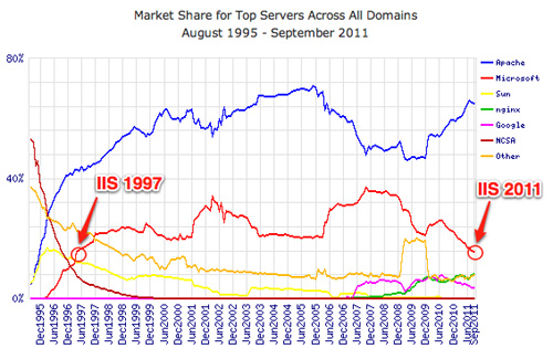 Apache一直作为互联网上使用最广泛的服务器从web早期延续至今,居于第二位的应该属微软的IIS了。但是,各种迹象表明,IIS现在正在走下坡路了,其市场份额是在不断的下跌。究竟背后是什么因素在促使这种情况发生呢?